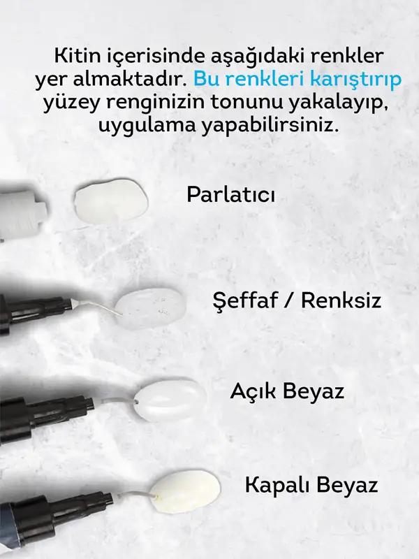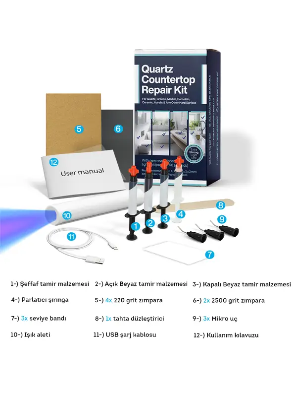Granit tamir kitimiz granit, mermer, porselen, kuvars ve diğer yüzeylerdeki kırık talaşları onarmayı çocuk oyuncağı haline getirmek için özel olarak tasarlanmıştır. Profesyonelleri işe almanıza veya yenisini alıp bir servet harcamanıza gerek yok – Kitimiz, çipleri kendiniz kolayca düzeltmenize ve sorunsuz sonuçlar elde etmenize olanak tanır. Fayans tamir kiti ve akrilik küvet tamir kiti olarak da kullanmak için idealdir.