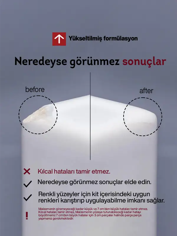 KILCAL HATALARI VE 7 CM’DEN BÜYÜK HATALARI TAMİR ETMEZ. Malzemenin giremeyeceği kadar küçük hatalar yüzeyde tutunamayacağı için tamir başarılı sonuç vermez. – 7 cm’den büyük hatalarda malzeme küreleşmeyeceği ve yüzeyin zımparalanması zor olduğu için başarılı sonuç vermez